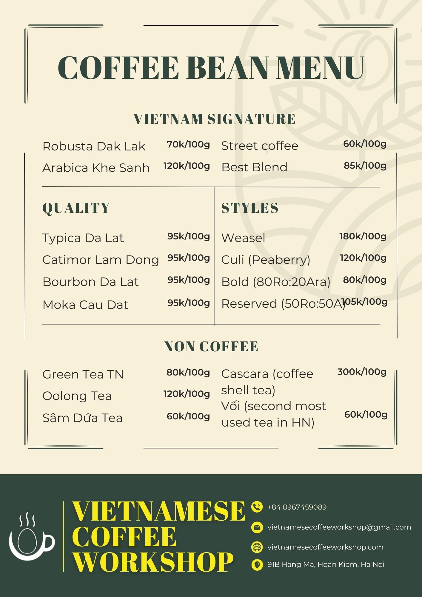 At a Vietnamese coffee workshop, you can expect to find a variety of coffee beans, often sourced from different regions within Vietnam. Here are some common types of coffee beans you might find: